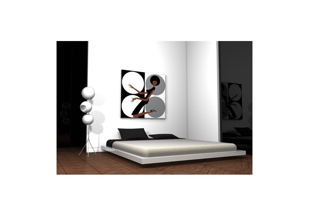 Un tableau pop & swing pour nous mettre de bonne humeur dès le matin. La silhouette d’une femme pétillante et élancée sur un fond graphique où s’alternent des ronds de couleurs donne un petit côté disco et musical à cette toile déco.