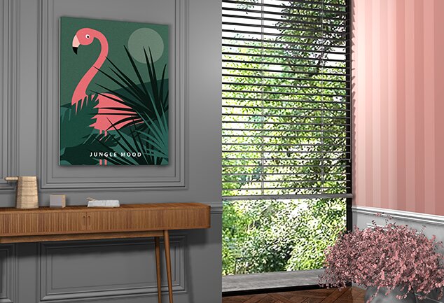 Un peu d’exotisme et de verdure pour votre salon ou votre véranda, avec ce poster tropical qui remet au goût du jour le style jungle chic avec des verts profonds et reposants peuplés de flamants roses et autres bipèdes colorés tout aussi dépaysants !
